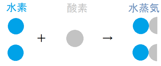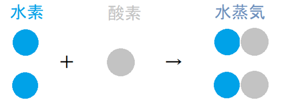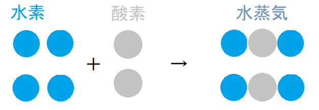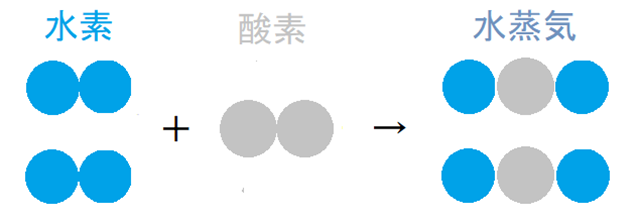 この分子説に従って、水素は水素原子2個からなる分子、酸素は酸素原子2個からなる分子、そして水蒸気は水素原子2個と酸素原子1個からなる分子であると考えて、先程の気体反応の法則を説明すると、